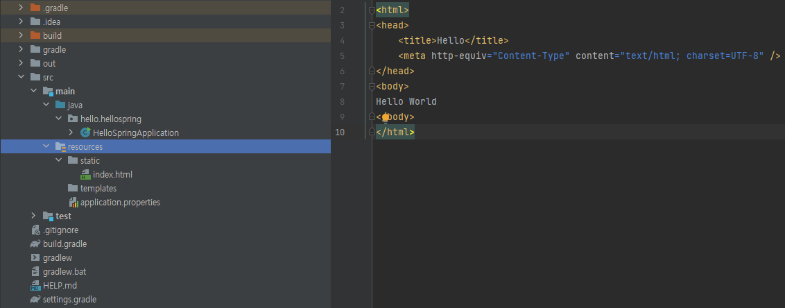 사진과 같이 프로젝트를 만들고 난 후 src/main/resources/static 폴더에 index.html을 만들고 실행하고